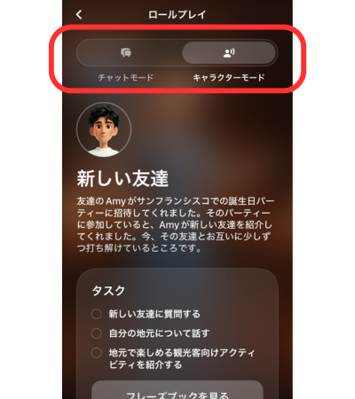 フリートークでは、文字だけのチャットモードとキャラクターモードが選べます。