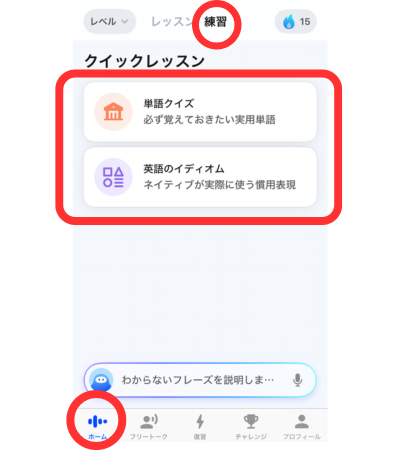 クイックレッスンには、「かならず覚えておきたい実用単語」と「ネイティブが実際に使う慣用表現」が学べる2種類のクイズがあります。